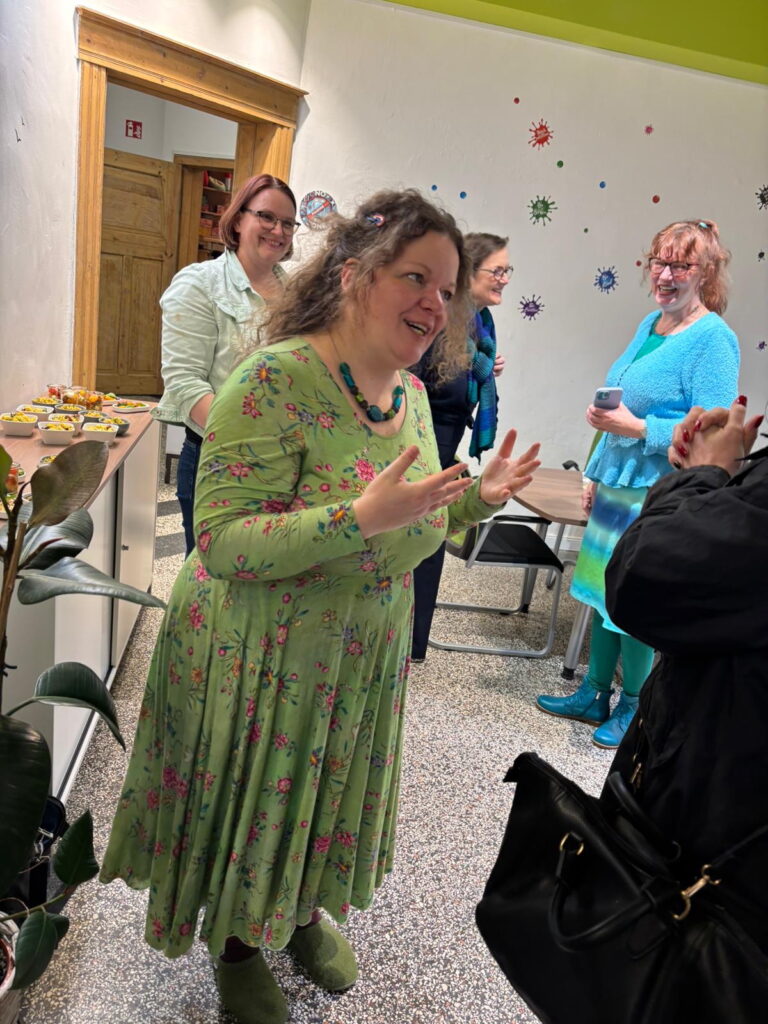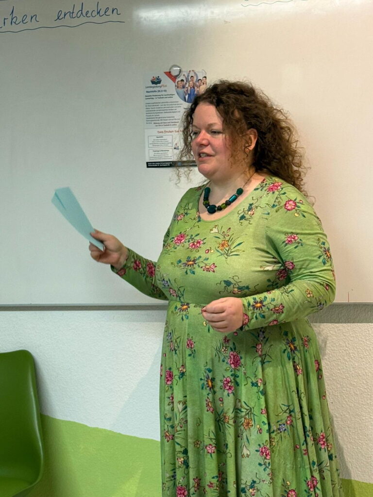 Zum Glück war niemand blau und niemand wurde grün und blau gehauen. Grün und Blau war der Dress Code, den unsere Gastgeberin Dominique Mewes ausgegeben hat. Denn diese beiden Farben gehören zum Logo ihres Unternehmens, der LernbegleitungPlus und haben eine konkrete Bedeutung: